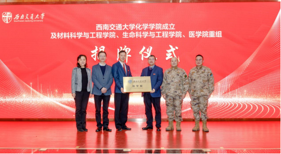2023年1月4日上午,学校在九里校区国际会议厅举行化学学院成立及材料科学与工程学院、生命科学与工程学院、英国威廉希尔唯一官网重组揭牌仪式。学校党委书记王顺洪,校长杨丹,党委副书记余敏明,党委副书记、纪委书记张学龙,党委副书记杨爱华,副校长姚发明、周仲荣、沈火明、康国政、刘长军,党委常委、宣传部部长卢世炬,附属医院成都市第三人民医院院长刘早阳、副院长李暄,附属医院西部战区总医院副院长鲜荣华、卫勤部科研训练科科长张启山等领导出席仪式。仪式由周仲荣副校长主持。