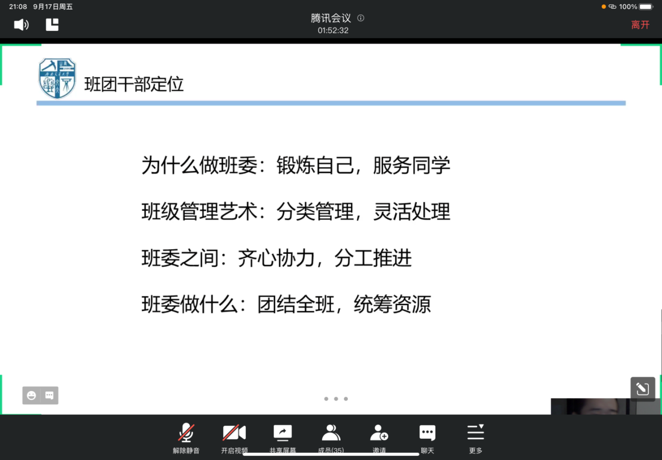 为增强威廉希尔官网学生干部的全局意识、服务意识、责任意识、效率意识,提高学生干部队伍整体素质。2021年9月17日晚,英国威廉希尔唯一官网2021级新生入学教育之班团干部培训通过线上讲座方式开展,讲座由英国威廉希尔唯一官网学工组副组长胡豪老师主讲,英国威廉希尔唯一官网辅导员黄雪梅、组织员蔡俊俊、2021级新生班委和高年级新任班委共20余名班团干部参加讲座。