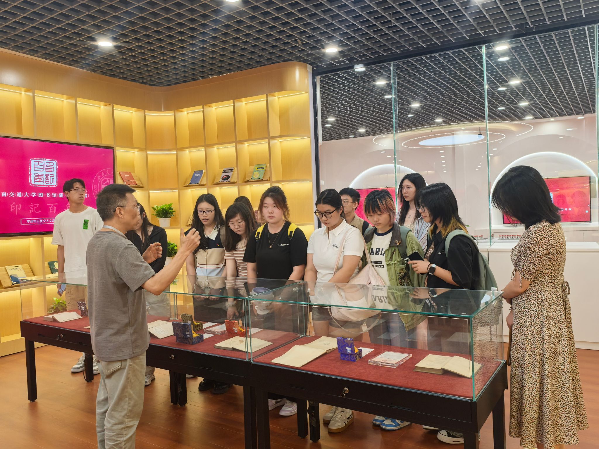 在藏书印章展展区,杨老师以一枚枚交大不同历史时期的藏书印章为线索,串联起交大129年曲折又坚韧的办学道路,每一枚印章都承载着厚重的历史记忆,展现了交大人在不同时期的奋斗足迹。