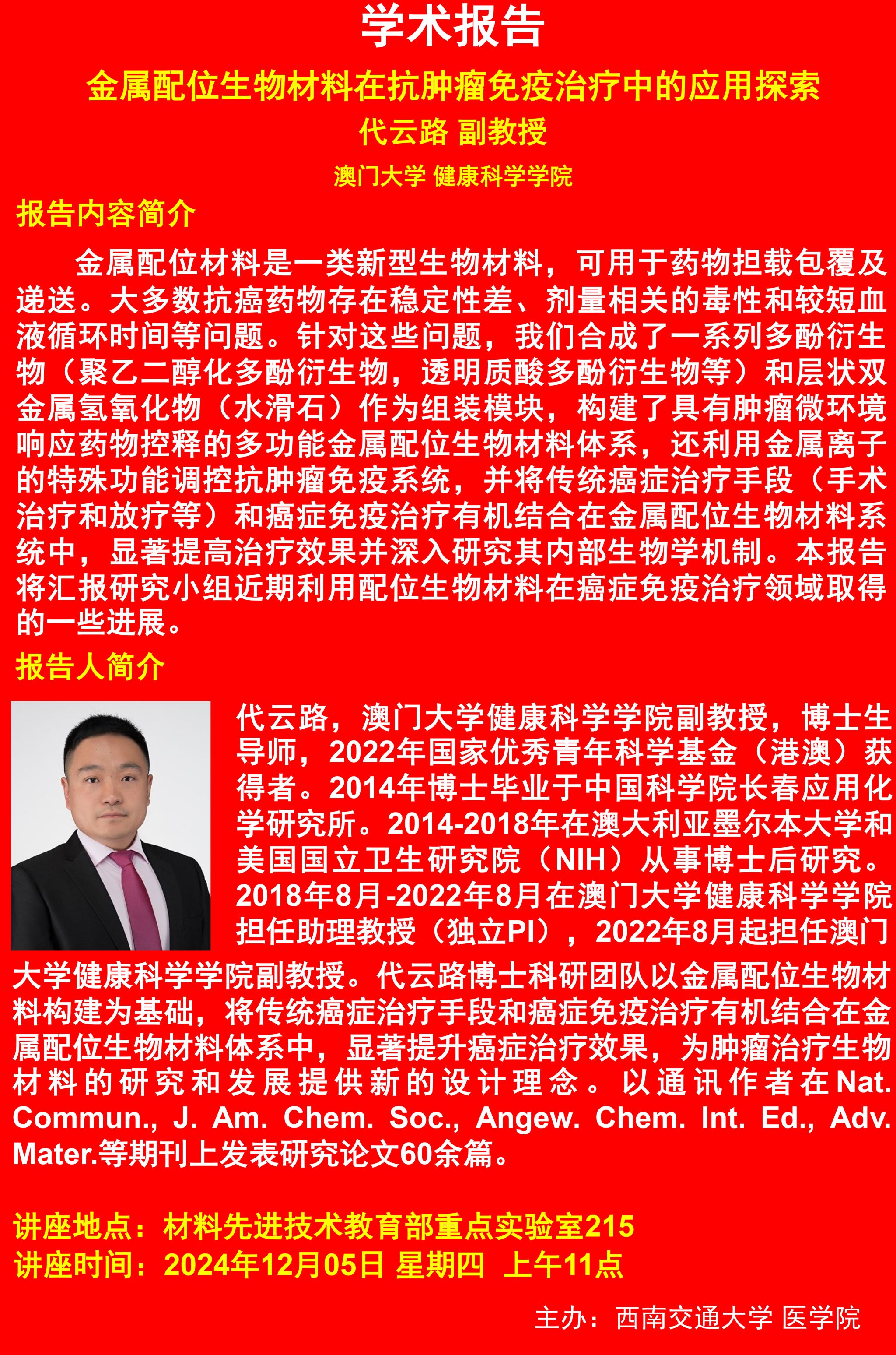 代云路,澳门大学健康科学学院副教授,博士生导师,2022年国家优秀青年科学基金(港澳)获得者。2014年博士毕业于中国科学院长春应用化学研究所。2014-2018年在澳大利亚墨尔本大学和美国国立卫生研究院(NIH)从事博士后研究。2018年8月-2022年8月在澳门大学健康科学学院担任助理教授(独立PI),2022年8月起担任澳门大学健康科学学院副教授。代云路博士科研团队以金属配位生物材料构建为基础,将传统癌症治疗手段和癌症免疫治疗有机结合在金属配位生物材料体系中,显著提升癌症治疗效果,为肿瘤治疗生物材料的研究和发展提供新的设计理念。以通讯作者在Nat. Commun., J. Am. Chem. Soc., Angew. Chem. Int. Ed., Adv. Mater.等期刊上发表研究论文60余篇。